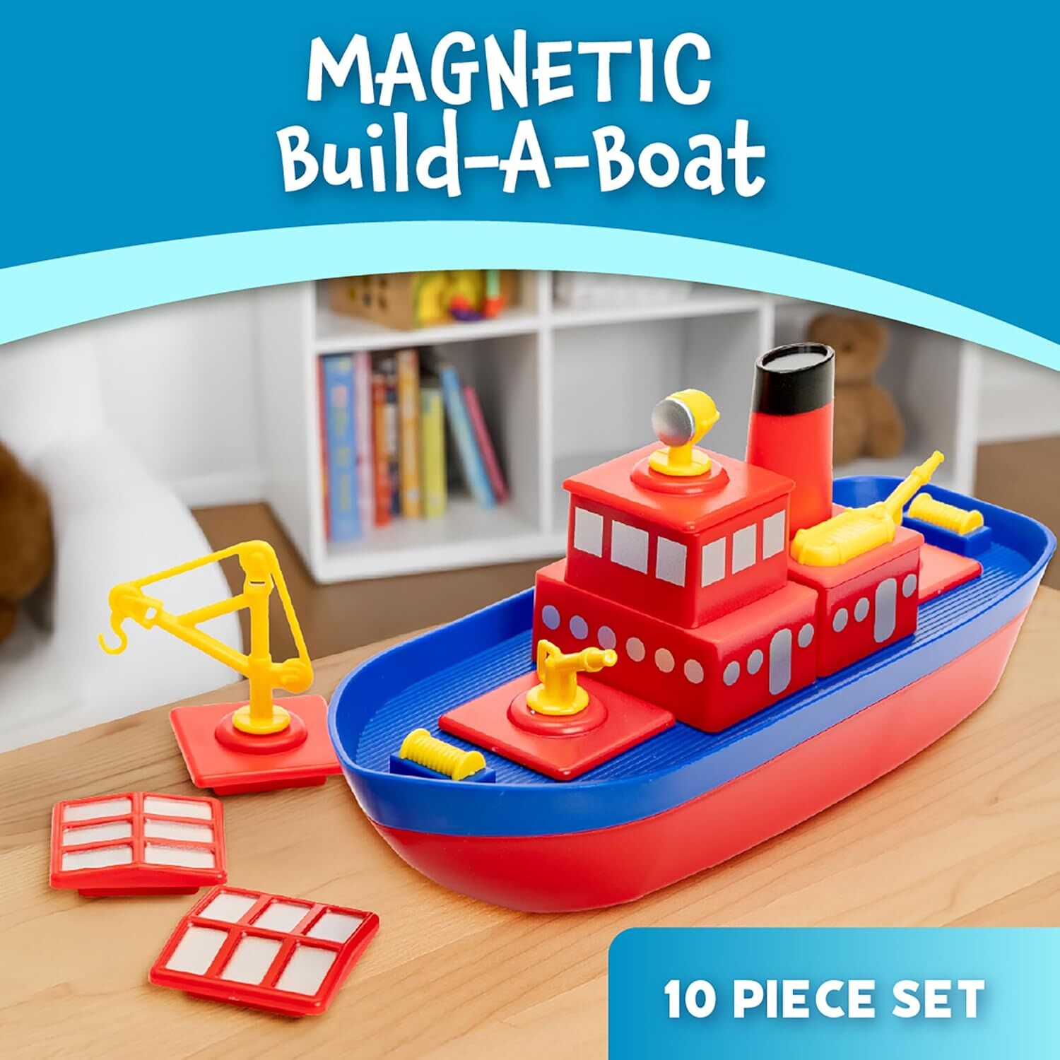 Popular Playthings Magnetic Build A Boat comes with 10 colorful pieces that allow you to build a fireboat, tug boat, freighter, oil tanker, fishing boat or the boat of your dreams. The secret lies in our hidden magnetic locking system that makes both assembly and disassembly a snap. Once you've built your boat, you're ready to launch her in your bathtub, sink or swimming pool. Our waterproof hull guarantees a safe voyage and hidden wheels make her easy to push for those who are landlocked. Develop critical thinking skills.